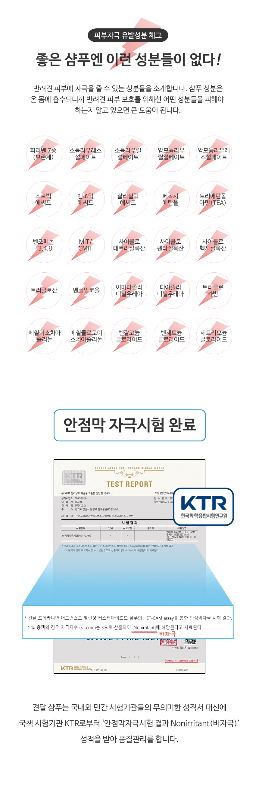 | 사용할 때의 주의사항 | 1. 용도 외에는 사용하지 말 것 2. 본 제품은 먹지 마시고 만일 제품을 먹었을 경우 즉시 전문의 또는 수의사와 상담할 것 3. 눈에 들어갔을 경우 즉시 흐르는 물로 씻어낼 것 4. 사용 중 붉은 반점, 부어오름, 가려움증, 자극 등의 이상이 있을 경우 사용을 중지해야 하며, 계속 사용하면 증상이 악화되므로 수의사에게 상담할 것 5. 상처가 있는 부위, 습진 및 피부염 등의 이상이 있는 부위에는 사용하지 말 것 6. 사용 후 충분히 물로 씻어내지 않으면 탈모 또는 탈색의 원인이 될 수 있으므로 사용 후 충분히 물로 씻어낼 것 7. 제품의 내용물과 접촉 시 미끄러질 우려가 있으니 주의할 것 8. 동물, 유아, 소아의 손이 닿지 않는 곳에 보관할 것 |