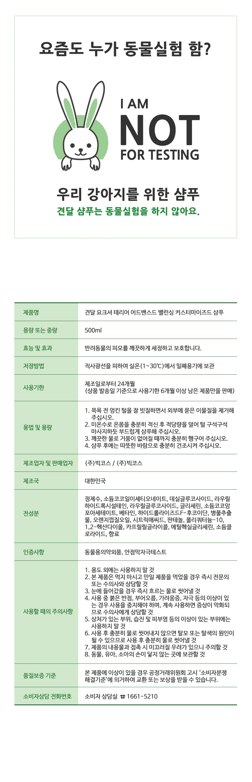 | 사용할 때의 주의사항 | 1. 용도 외에는 사용하지 말 것 2. 본 제품은 먹지 마시고 만일 제품을 먹었을 경우 즉시 전문의 또는 수의사와 상담할 것 3. 눈에 들어갔을 경우 즉시 흐르는 물로 씻어낼 것 4. 사용 중 붉은 반점, 부어오름, 가려움증, 자극 등의 이상이 있을 경우 사용을 중지해야 하며, 계속 사용하면 증상이 악화되므로 수의사에게 상담할 것 5. 상처가 있는 부위, 습진 및 피부염 등의 이상이 있는 부위에는 사용하지 말 것 6. 사용 후 충분히 물로 씻어내지 않으면 탈모 또는 탈색의 원인이 될 수 있으므로 사용 후 충분히 물로 씻어낼 것 7. 제품의 내용물과 접촉 시 미끄러질 우려가 있으니 주의할 것 8. 동물, 유아, 소아의 손이 닿지 않는 곳에 보관할 것 |